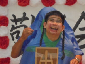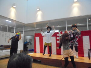 15日の職員余興では「長生き音頭」を職員が歌い上げ、ご利用者様も自然と手拍子をしながら楽しまれていました。続いての二人羽織では、男性職員が体を張って化粧をされる姿やシュークリームを食べる場面では大笑い。最後に仮装した職員が「電線音頭」を披露し、会場はさらに盛り上がりました。