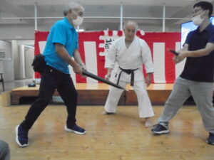16日の職員余興では、長生き音頭に続き、オレンジの衣装を着た職員がベリーダンスを披露。男性の利用者様は笑顔でご覧になり、女性の利用者様からは「きれいね」「上手だね」と声があがりました。最後に空手の演武で、杉板を3枚、正拳突き・手刀・肘で割り、さらにバットを手刀で割る姿に大きな歓声と拍手が送られました。