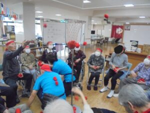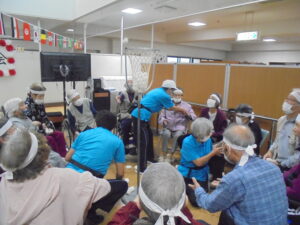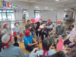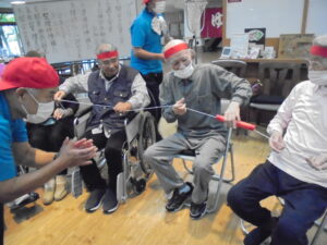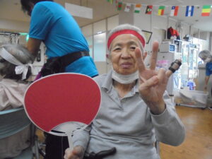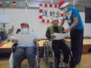 開会式では両チーム代表の利用者様に元気いっぱいの選手宣誓をしていただき、職員による応援団も登場し、大きな声援で会場を盛り上げました。