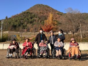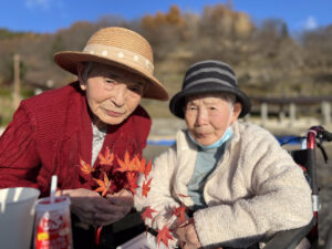 令和7年11月、何回かに分かれて紅葉ドライブを行いました。塩山ふれあいの森総合公園で紅葉を見ながらおやつを食べたり、
