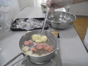 丸めたお団子は職員が茹で、茹であがったお団子に温かい餡子汁をかけて、提供しました。