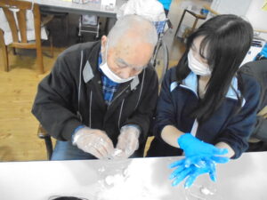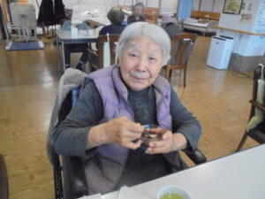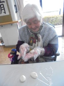 生地はお一人ずつに分け、利用者様に丸めていただきました。「昔はよく作ったよ」「形が難しいね」など会話を楽しまれながら、皆様真剣な表情で取り組まれていました。