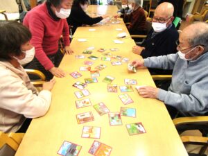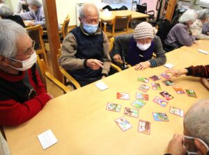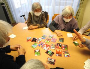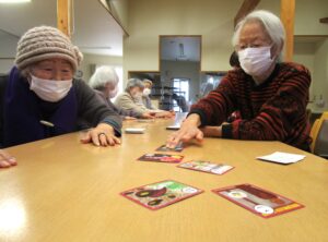 1月5日(月)~1月10日(土)年明け最初は、みなさんで「お正月遊び」をして楽しみました。特に【かるた大会】は全体を何ヶ所かのグループに分け、同じカルタを並べ、職員が読み上げると必死になって札を取る姿が楽しく、大いに盛り上がりました!久しぶりのお正月遊びに、みなさん喜んでいただけた様子で、笑顔が絶えない時間となりました。 今年も利用者さんが毎回「楽しく喜ん」で、「元気」に「長生き」していただけるよう職員一同、精一杯サポートさせていただきます♪