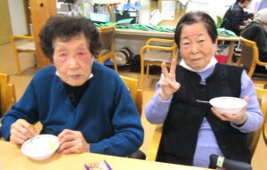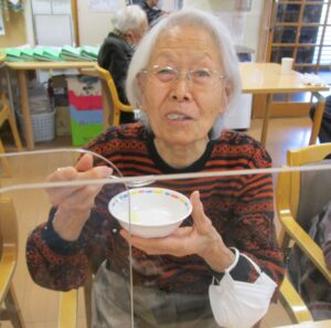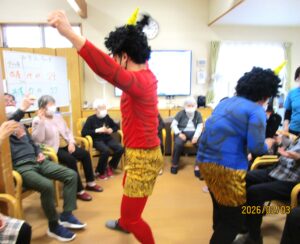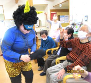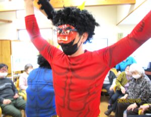 2月3日(火)に毎年恒例の【節分豆まき】を行いました!今年も、「赤鬼」と「青鬼」の急な登場に豆を投げつけ、次にお手玉で『鬼は外!福は内!!』と大きな声で言いながら、みなさんおもいきりぶつけていました!普段見たことのない表情をして、必死に投げている姿がとても印象的でした。ストレス解消になり、みなさん喜んでいただけた様子で、笑顔が絶えない時間となりました。これからも、季節の行事を大事にしながら、利用者さんが元気で長生きできるよう職員一同、精一杯サポートさせていただきます(^^)/