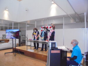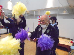 スタッフによる「青い山脈」「高校三年生」では、利用者様も一緒にボンボンを持って体を動かしていただきました。