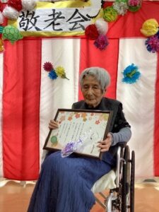 午後は記念品の授与式でした。まず、今年度中に100歳を迎えられる方(2名)に、甲州市役所から記念品(市・県・国)をいただいていましたので贈呈しました。そして、職員からの手作りの記念品と、古希・傘寿・卒寿・白寿・百寿等の長寿の節目の年齢の方には、独自のお祝い状を作成しお渡ししました。