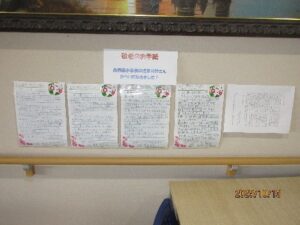 しかし、コロナ禍以降は感染対策のため、児童からの「敬老のお手紙」を読んでいただく程度に制限され残念な状態が続いていました。そのような中で、昨年度は受け取るだけでなく、こちらからもお手紙の返事を書いていただきました。そして、それを学校に届け児童に還元してもらうことで、小さいながらも交流の再開に向けての第1歩としました。